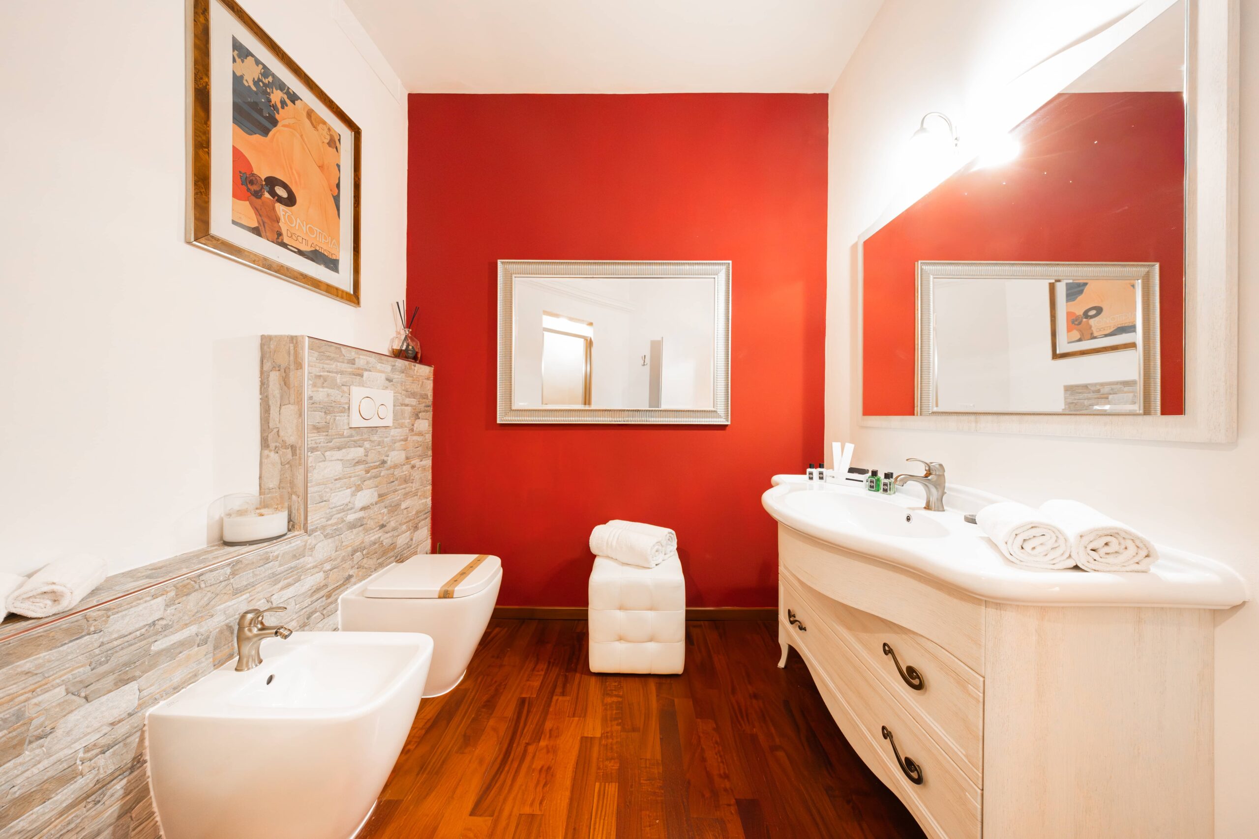 Le pareti rosse, le tende dorate e il letto su pedana in legno evocano l’eleganza dei palazzi storici cittadini. I quadri che ritraggono Bologna e le luci calde creano un’atmosfera intima e prestigiosa, ideale per chi desidera vivere un soggiorno dal carattere autentico, immerso nel raffinato stile borghese.