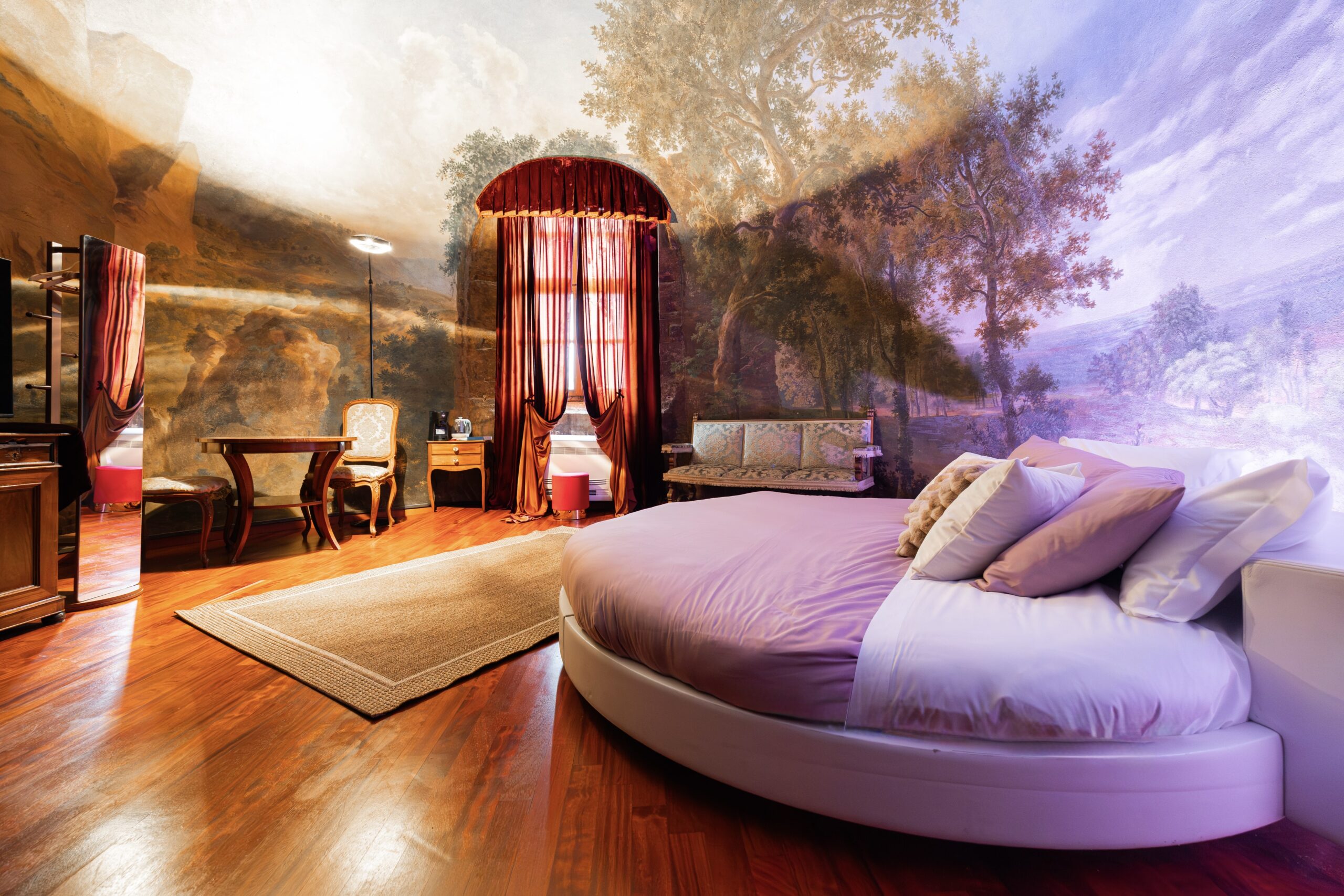 Una suite fiabesca dove il romanticismo incontra l’incanto. Avvolta da un affresco panoramico che richiama atmosfere senza tempo, la camera offre un letto rotondo con giochi di luce soffusi, arredi ricercati e dettagli scenografici che ricordano un castello incantato. Perfetta per chi desidera vivere un soggiorno magico, immerso in un’atmosfera da vera fiaba..